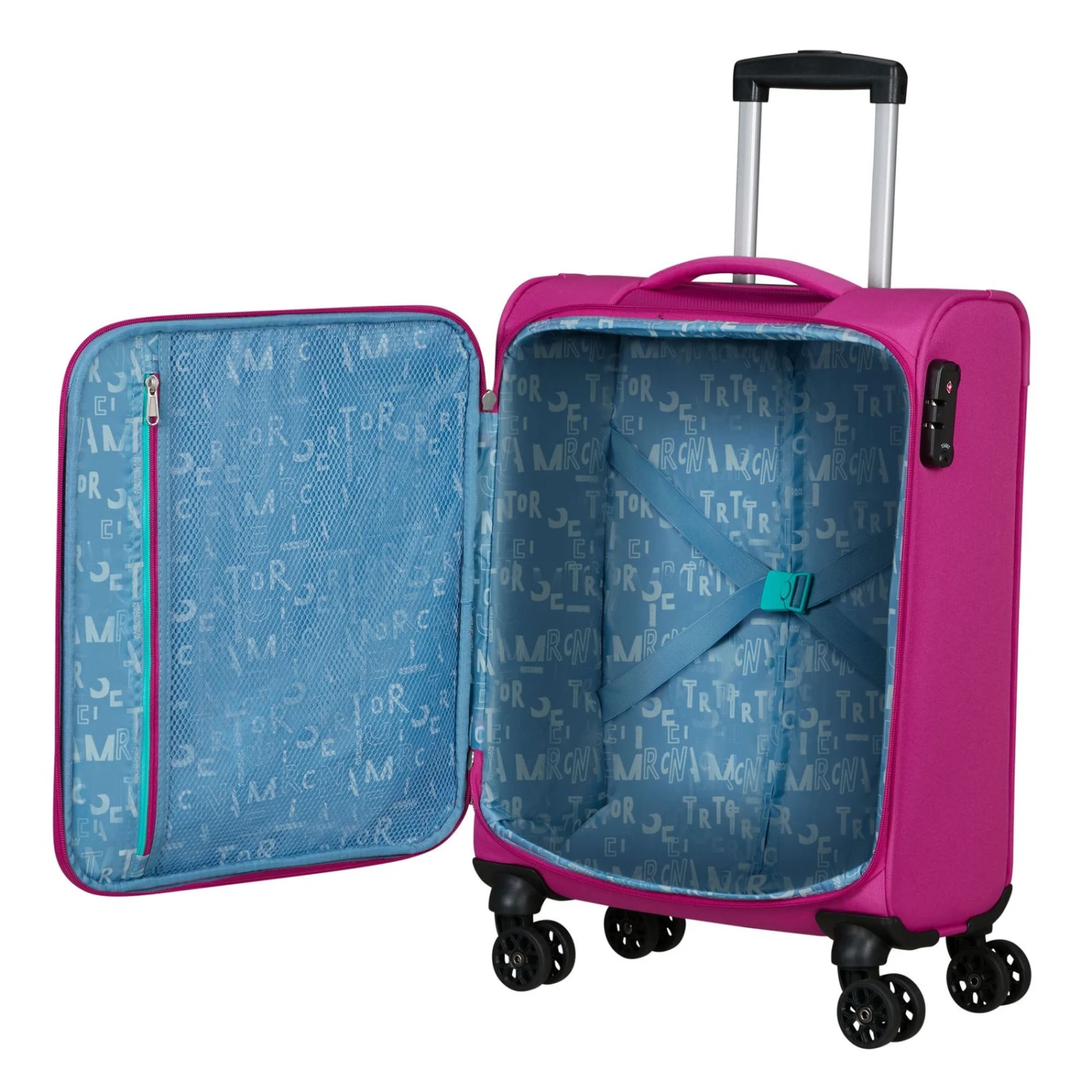 - Das American Tourister Logo ist gut sichtbar eingearbeitet